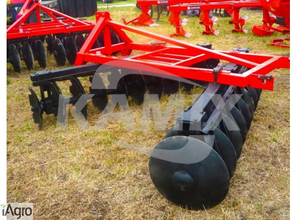Szerokość robocza 2,2 m, trzy podpory, ilość talerzy 2x10 szt., zapotrzebowanie mocy 45 KM, masa 440 kg, cena 3700 zł, z wałkiem strunowym 4400 zł