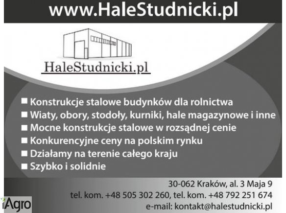 Zajmujemy się produkcją konstrukcji stalowych malowanych jak i cynkowanych. Do każdej konstrukcji wykonujemy projekt. Konstrukcje wykonujemy na bazie własnych projektów bądź powierzonych od Klienta. Nasze konstrukcje służą jako: hale produkcyjne hale magazynowe wiaty rolnicze obory kurniki chlewnie pieczarkarnie ujeżdżalnie przechowalnie płodów rolnych: zbóż, warzyw i owoców Oferujemy kompleksowy montaż konstrukcji, obicie płytami warstwowymi lub blachami trapezowymi , montujemy świetliki dachowe, instalacje i wylewki przemysłowe. Oferta dla farmerów Obiekty wykonane na bazie konstrukcji stalowej cechuje wytrzymałość i trwałość. Produkujemy i montujemy konstrukcje: wiat rolniczych obór kurników chlewni pieczarkarni przechowalni płodów rolnych ujeżdżalni dla koni chłodni mroźni www.HaleStudnicki.pl al. 3 Maja 9 30-062 Kraków Telefon 1: +48-505-302-260 Telefon 2: +48-792-251-674 e-mail: kontakt@halestudnicki.pl