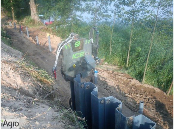 Używany wibromłot ICE EMV9 wysokiej częstotliwości w komplecie z uniwersalnym zaciskiem - rok produkcji 2011. Montowany na wysięgniku koparki oraz zasilany z hydrauliki koparki.